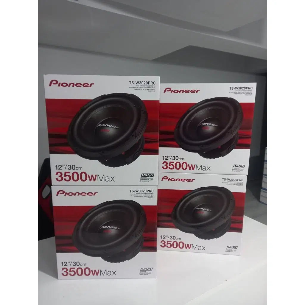 • Pioneer TS-W3020PRO PRO Samurai series - 12" High Efficiency Subwoofer (3500 W) Size 30 cm Type Subwoofer Maximum power 3500 W Continuous Power Output 1800 W Frequency response 20 Hz to 200 Hz (In-Car) Sensitivity 86 (1 W/In-car) dB